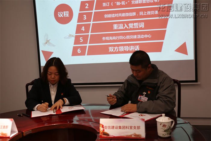 本次活動以“融·筑+”黨建結(jié)對共建為主題,全體黨員共同重溫入黨誓詞,堅定理想信念。龍信集團科室支部副書記施金浩與海門農(nóng)商行機關(guān)第三黨支部書記劉曉艷共同簽訂《“融·筑+”黨建聯(lián)盟協(xié)議書》,以“黨建互促、服務(wù)互聯(lián)、專業(yè)互助、資源互享、廉政互督”為原則建立聯(lián)系、加強溝通,實現(xiàn)信息共享、優(yōu)勢互補。現(xiàn)場黨員們共同創(chuàng)建“融·筑+”黨建結(jié)對共建微信群,同上“微黨課”《讓信仰之光在心中閃亮》。隨后大家重溫入黨誓詞并參觀海門農(nóng)商銀行同心圓黨建活動中心。